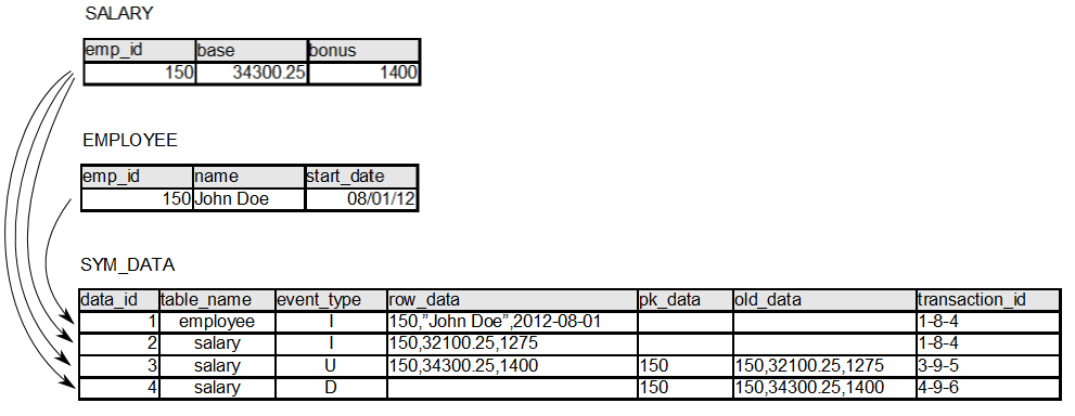 The logical trigger definitions result in database triggers being placed on tables to capture data to the SYM_DATA table. Capturing change data in this table allows SymmetricDS to guarentee ordering and atomicity of transational data, which means data is played back on the destination node exactly how it was recorded. An entry records a unique data ID sequence number, the event type (insert, update, or delete), a transaction ID, and change data. The transaction ID is shared by data committed as part of the same transaction. To accomodate different tables, change data is stored in comma separated value (CSV) format. Inserts record only the new row data. Deletes record the old row data along with the primary keys used. Updates record the new row data, old row data, and primary keys used.